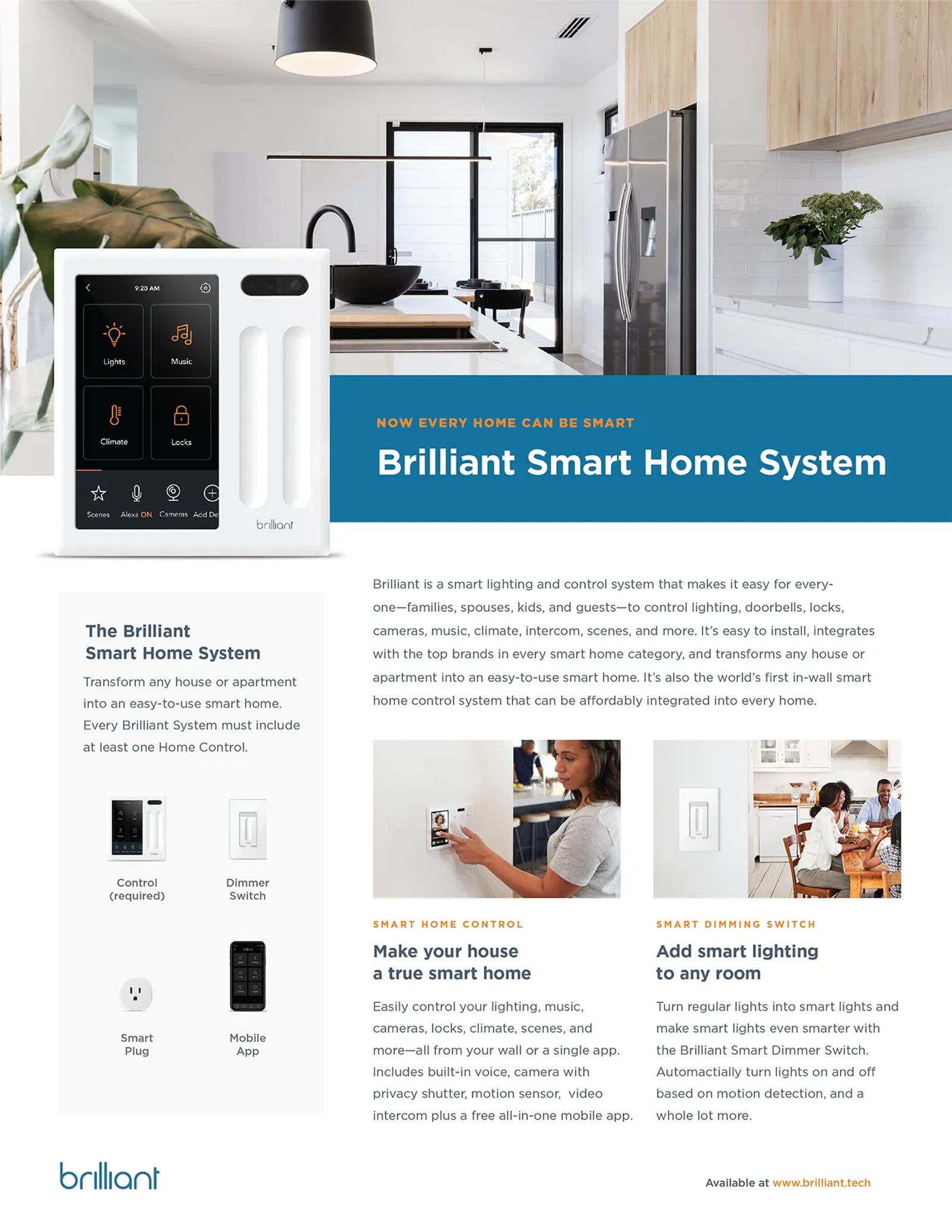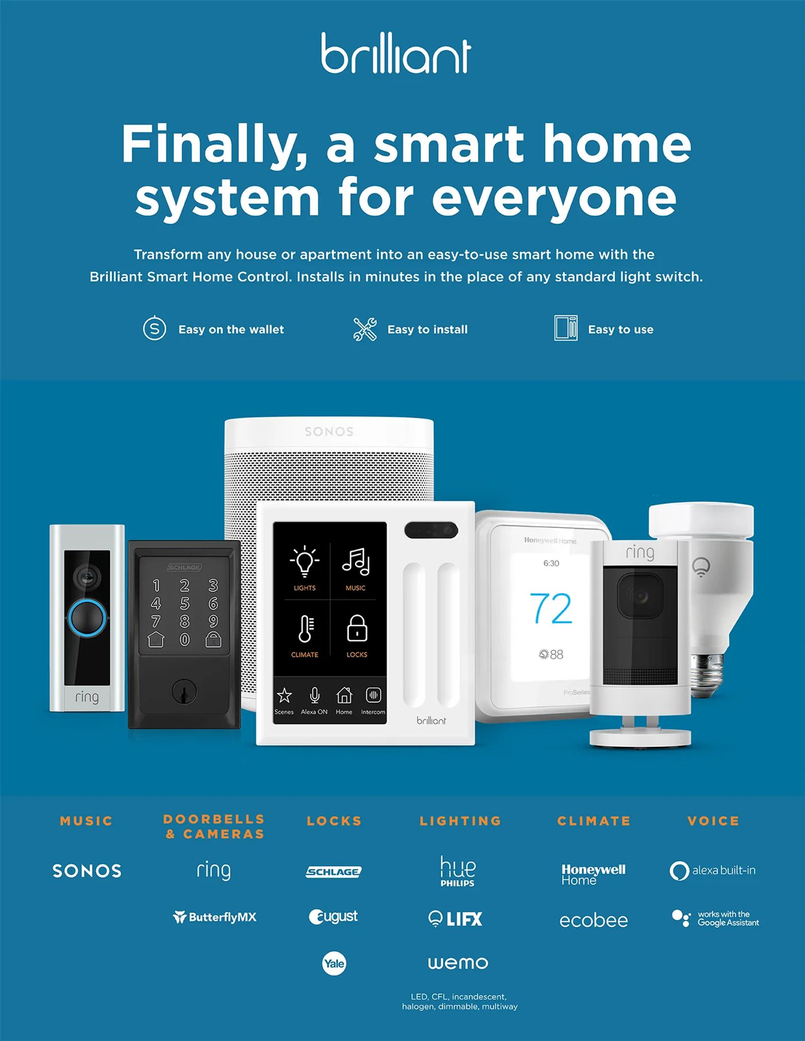 Brilliant is a smart lighting and control system that makes it easy for everyone–families, spouses, kids, and guests–to control lighting, doorbells, locks, cameras, music, climate, intercom, scenes, and more. It's easy to install, integrates with the top brands in every smart home category, and transforms any house or apartment into an easy-to-use smart home. It's also the worlds first in-wall smart home control system that can be affordably integrated into every home.